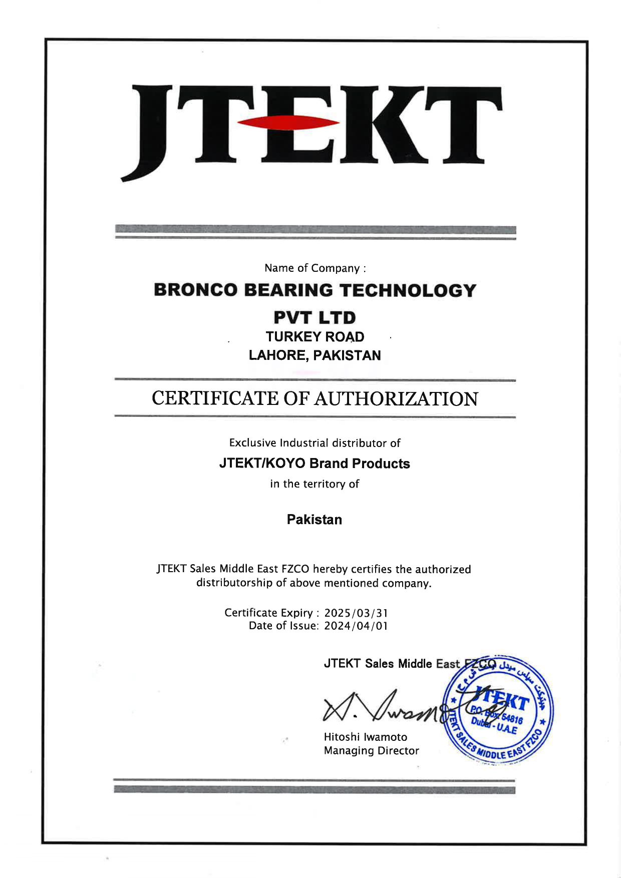 Bronco Bearing is Supplier Agency that is fully integrated with the major brands JTEKT(koyo). We strongly believe that only by the full control of the providing chain, from the purchasing of steel to after-sales services, it is possible to meet the requirements of the most demanding Pakistan markets which make up the core target of our company.